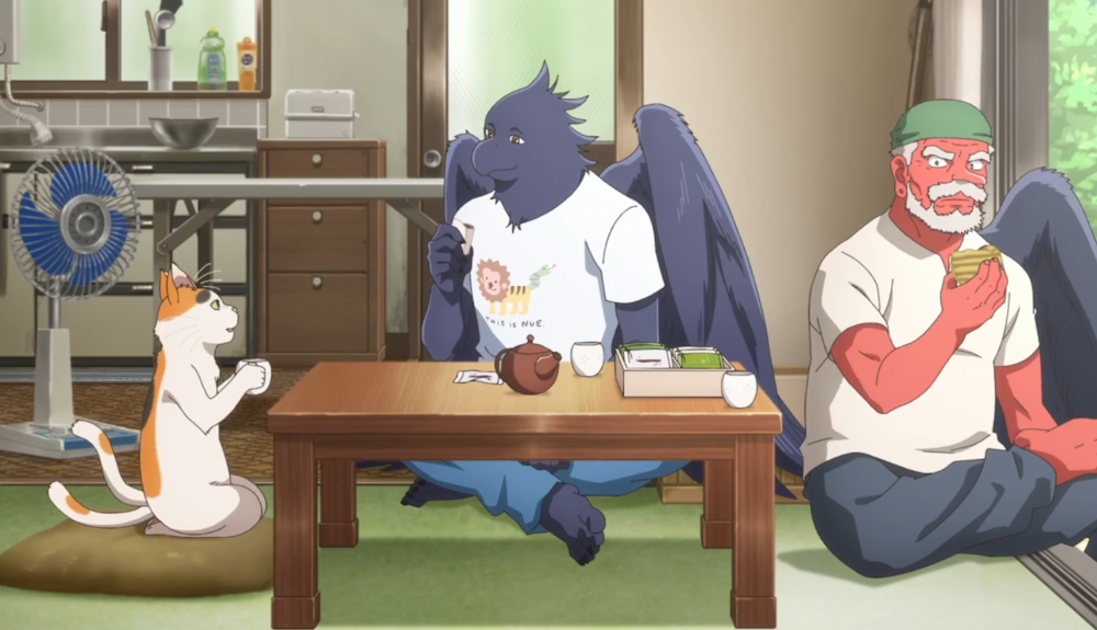 Some of the characters of Tonari no Yokai-San: Nekomata Buchio, Tengu Jiro and Tazenbou, drinking tea together.